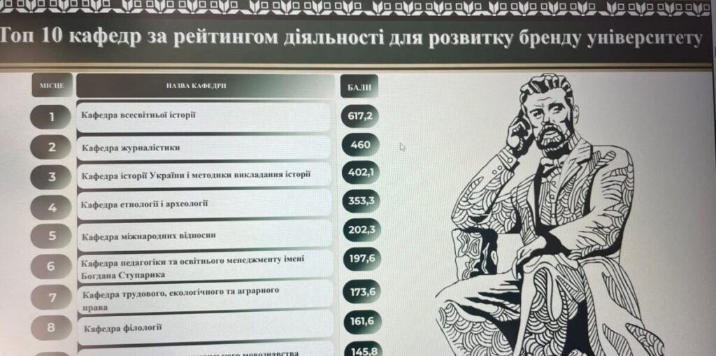 – Кафедра філології – на 31 місці.Приємно також те, що кафедра філології і кафедра педагогіки та психології ввійшли у топ-10 кафедр, які працюють для розвитку бренду університету, зокрема кафедра філології посіла восьме місце, а кафедра педагогіки та психології – 10 місце.Вітаємо наші кафедри, адже цей показник – це щоденна системна клопітка праця кожного науковця і кожної науковиці, методистів нашого інституту.